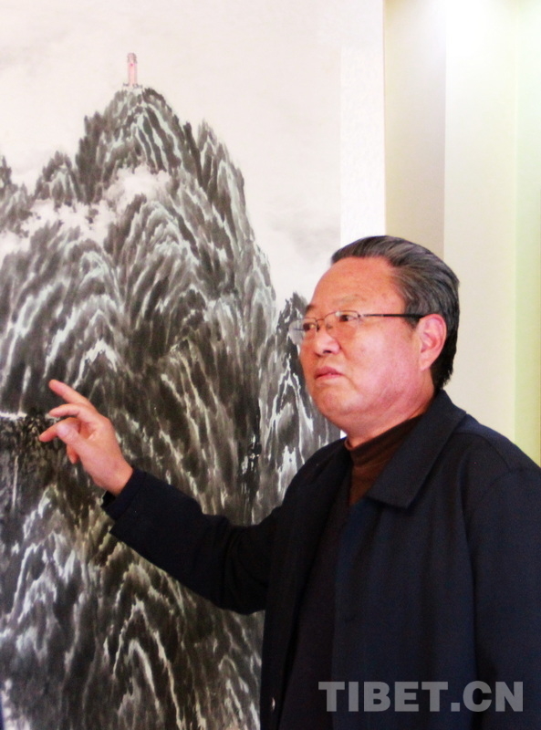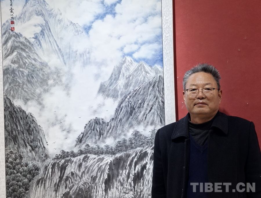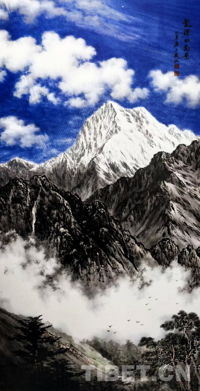 圖為王藏江與他的國(guó)畫(huà)作品《珠穆朗瑪》