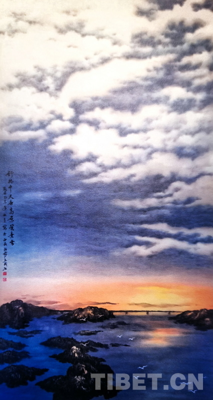 “這些云是用留白的方式留出來(lái)的。在西藏戍邊30多年,最難忘的就是西藏的藍(lán)天白云,變化萬(wàn)千,特別的美?!蓖醪亟⑿χ嗽斶@些飽含他情感的畫(huà)作,思緒又飄向了令他魂?duì)繅?mèng)繞的高原……