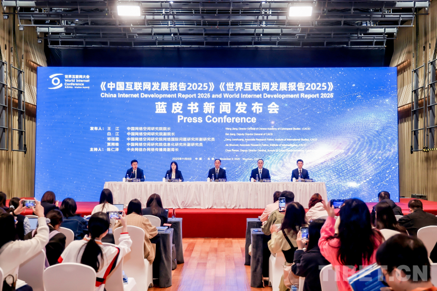 圖為《中國(guó)互聯(lián)網(wǎng)發(fā)展報(bào)告2025》《世界互聯(lián)網(wǎng)發(fā)展報(bào)告2025》藍(lán)皮書(shū)新聞發(fā)布會(huì)現(xiàn)場(chǎng)