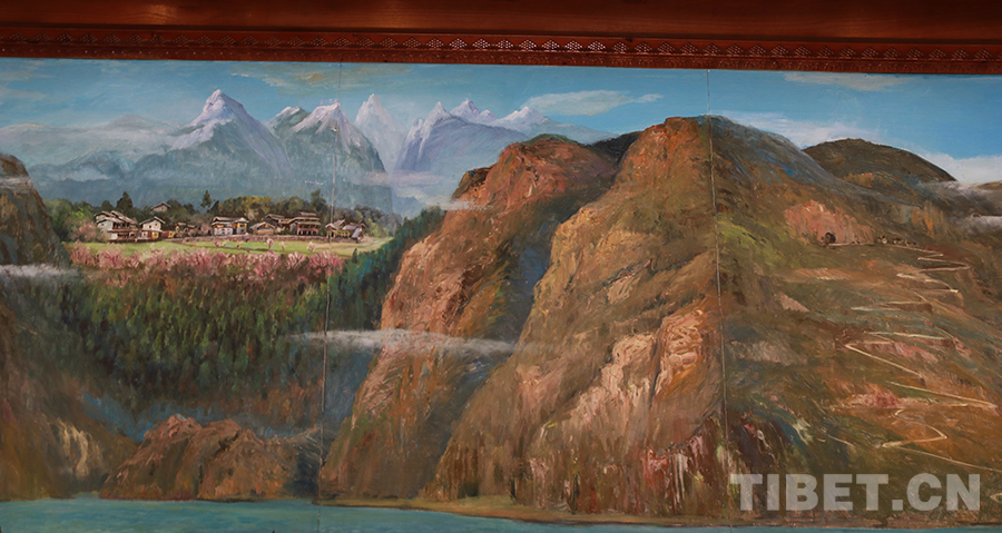 圖為色龍村內(nèi)建筑上的壁畫,生動描繪了色龍村所處的特殊地理?xiàng)l件,右邊的盤山公路蜿蜒通過隧道之后而有左邊的“桃花源” 攝影:王妍丹
