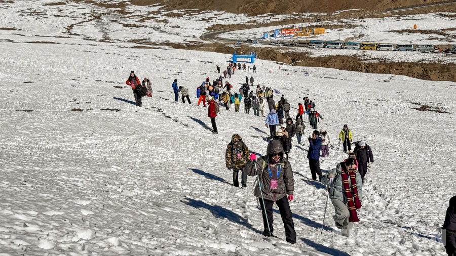 上午,隨著出發(fā)號(hào)令響起,隊(duì)伍在專業(yè)高山向?qū)У膸ьI(lǐng)下有序前行。參與者們運(yùn)用“三層穿衣法”有效御寒,借助登山杖、防滑冰爪等專業(yè)裝備穩(wěn)健踏雪。途中,向?qū)Р粌H全程監(jiān)護(hù)安全,實(shí)時(shí)提示高海拔適應(yīng)知識(shí)與冰雪行走技巧,更將徒步變成了一堂生動(dòng)的戶外教學(xué)課。面對(duì)陡坡路段,大家自發(fā)組成“互助小隊(duì)”,彼此攙扶、鼓勵(lì)加油,原本陌生的面孔在并肩前行中迅速熟絡(luò),團(tuán)隊(duì)的溫暖與凝聚力在寒風(fēng)中悄然升騰。不少人放慢腳步,用鏡頭記錄下“隨手拍即是大片”的壯麗景致,或與同伴在雪地上留下創(chuàng)意合影,歡聲笑語(yǔ)回蕩在靜謐的山谷之間。