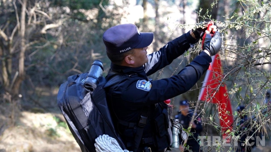 圖為民警在巡邊途中系上紅繩以作標(biāo)記
