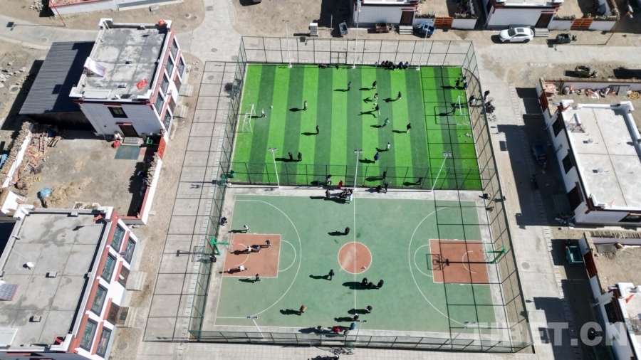 圖為定日縣長(zhǎng)所鄉(xiāng)森嘎村的足球場(chǎng)和籃球場(chǎng)