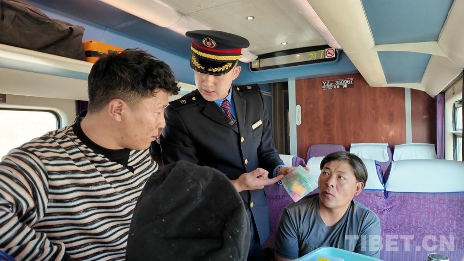 圖為乘務(wù)員用漢語、藏語、英語播報(bào)乘車注意事項(xiàng) 攝影:陳衛(wèi)國(guó)