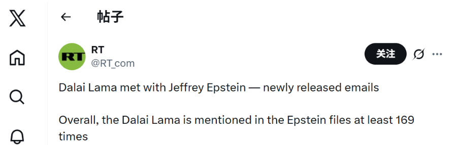 同日,“今日俄羅斯”(RT)在X上發(fā)布貼文稱,“達(dá)賴曾與杰弗里·愛(ài)潑斯坦會(huì)面——最新公布的郵件??偟膩?lái)說(shuō),在愛(ài)潑斯坦的文件中,達(dá)賴至少被提及169次”。