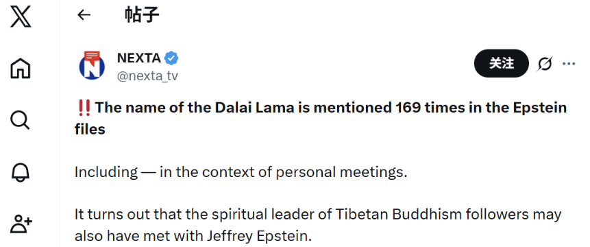 同日,白俄羅斯媒體“Nexta TV”在社交媒體平臺(tái)X上發(fā)布的貼文稱:達(dá)賴的名字在愛(ài)潑斯坦文件中出現(xiàn)169次,并提到“包括私人會(huì)面”。