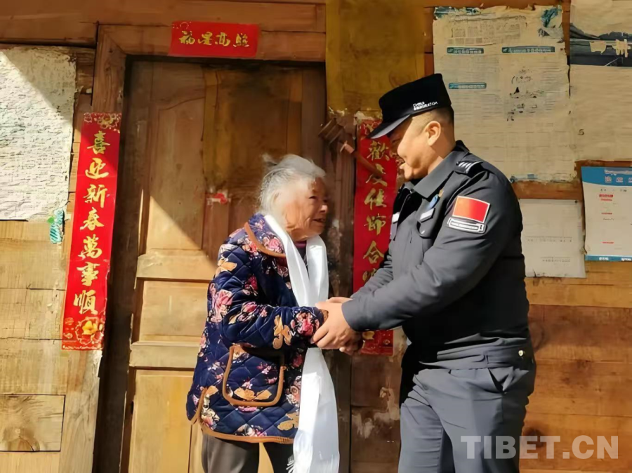 圖為2023年,竹瓦根邊境派出所民警仁青達瓦在春節(jié)期間看望卓給老人