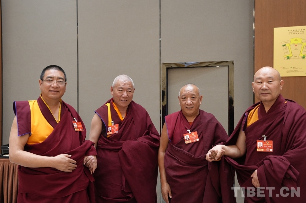 兩會(huì)喜相逢,多位宗教界政協(xié)委員在會(huì)議間歇合影留念,從左至右分別為:賽赤·確吉洛智嘉措、江白拉桑、扎西堅(jiān)才、桑杰·嘉措