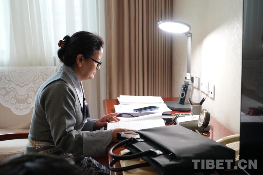 全國兩會期間,全國人大代表尼珍在駐地閱讀文件 攝影:邊子捷