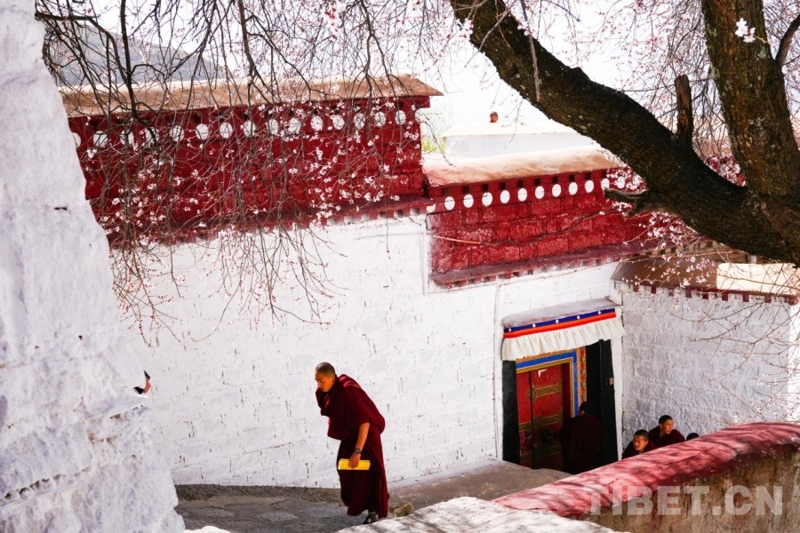 帕邦喀寺內(nèi),僧人從白墻與桃花下走過,構(gòu)成春日里的別樣風(fēng)景 攝影:張藝彤