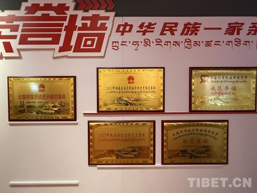 民族團(tuán)結(jié)進(jìn)步教育基地展館榮譽(yù)墻展示切娃鄉(xiāng)和普納村民族團(tuán)結(jié)進(jìn)步獎項(xiàng)