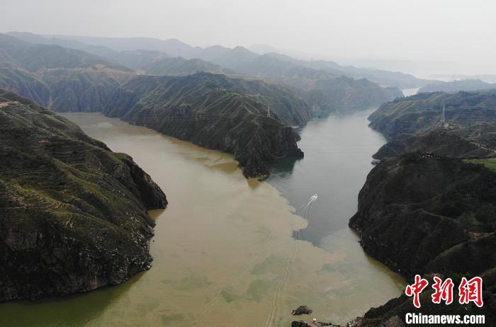 圖為甘肅永靖縣劉家峽遠眺洮河匯入黃河,入河口呈現(xiàn)出“二龍戲珠”的交匯奇觀。兩條河流匯聚于此,“涇渭分明”,交融卻不滲透,再加上河中石山,猶如兩條巨龍游戲于此,在當?shù)剡@景象也被稱為“二龍戲珠”。(資料圖) 楊艷敏 攝