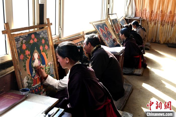 圖為1月13日,唐卡畫(huà)師們?cè)诶L制唐卡。中新社記者 安源 攝