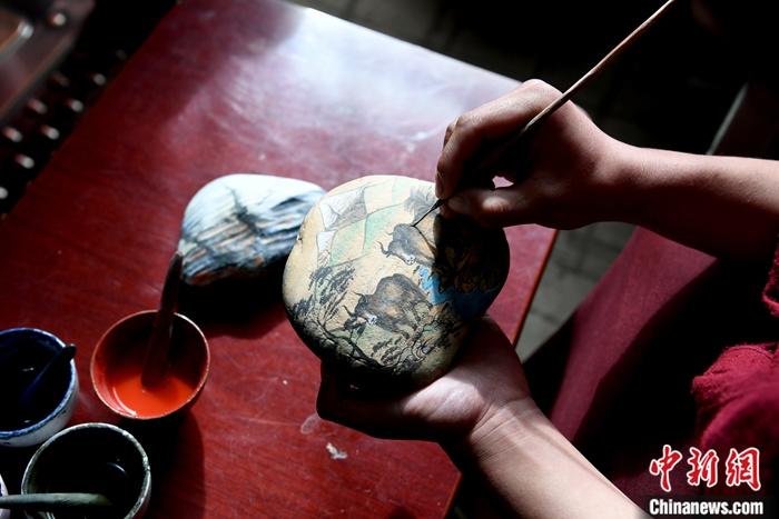 圖為1月13日,唐卡畫(huà)師在一塊石頭上繪制以“高原之舟”牦牛為主題的唐卡。中新社記者 安源 攝