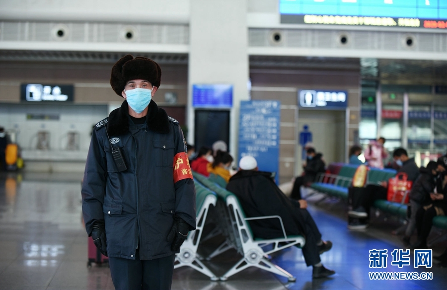 圖為西寧站內(nèi)正在維護(hù)秩序的保安。新華網(wǎng) 李俊 攝
