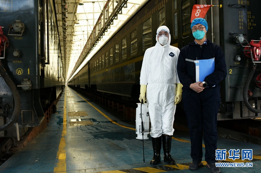 在西寧車輛段車庫內(nèi),防疫人員對每列旅客列車進(jìn)行全面殺毒。新華網(wǎng) 李俊 攝