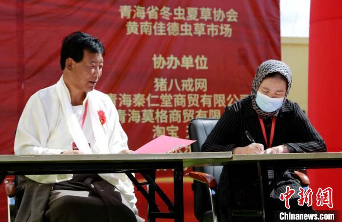 圖為企業(yè)家與供貨商在現(xiàn)場(chǎng)簽定供銷合同。青海省冬蟲夏草協(xié)會(huì)供圖