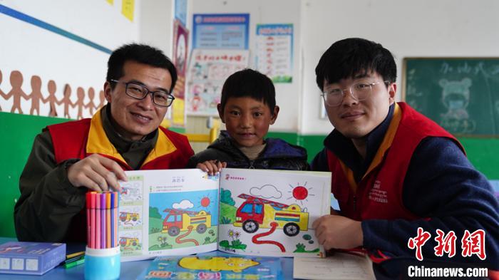 圖為黨員服務(wù)隊(duì)隊(duì)員與孩子一起完成繪畫(huà)。 昂尕 攝