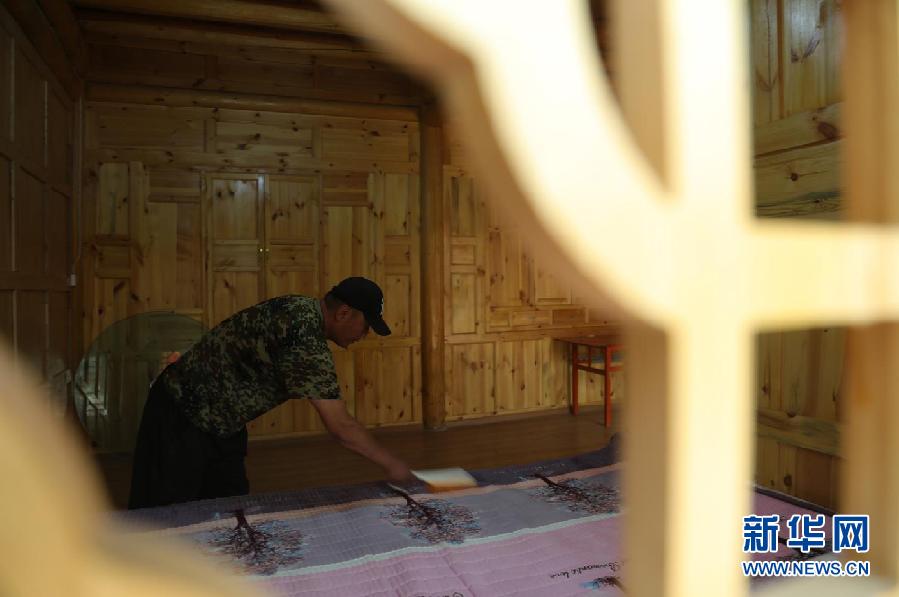 6月4日,在青海省海南藏族自治州貴德縣尕讓鄉(xiāng)松巴村,村民在整理農(nóng)家樂床鋪。新華社 央秀達(dá)珍 攝