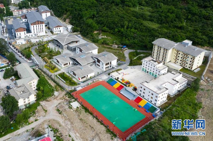 這是四川省阿壩藏族羌族自治州九寨溝縣九寨溝小學(xué)(原漳扎鎮(zhèn)小學(xué))和九寨溝縣第二人民醫(yī)院(后)(無人機照片,6月18日攝)。 新華社記者 沈伯韓 攝