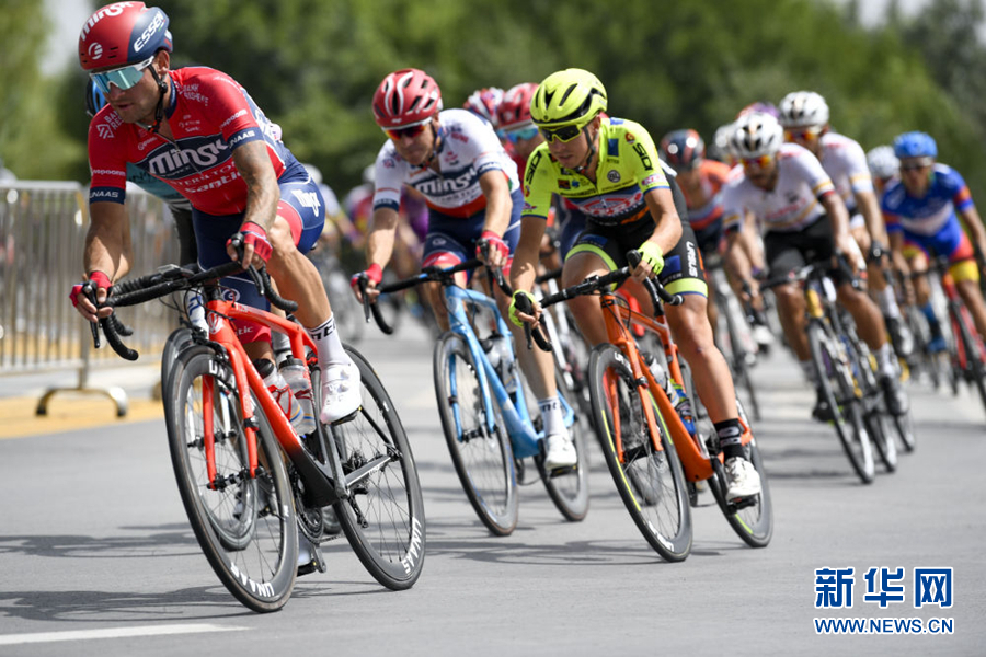 2019年7月27日,參賽車手在比賽中。當(dāng)日,第十八屆環(huán)青海湖國際公路自行車賽結(jié)束最后一個(gè)賽段——寧夏銀川繞圈賽的角逐。新華社 馮開華 攝