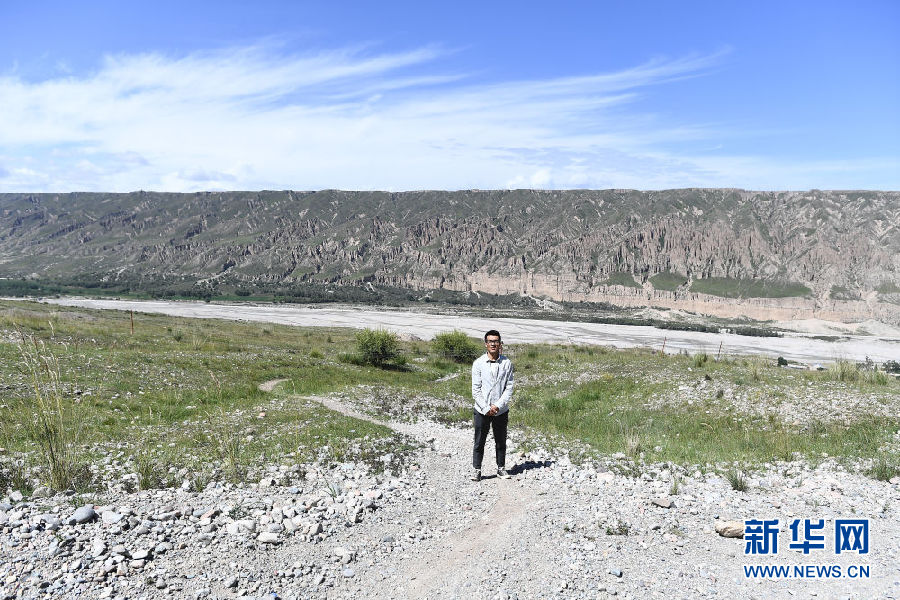 8月13日,尤拉太在夏塘村留影,他身后的山路是他上小學(xué)時步行前往學(xué)校的必經(jīng)之路。新華社記者 張宏祥 攝