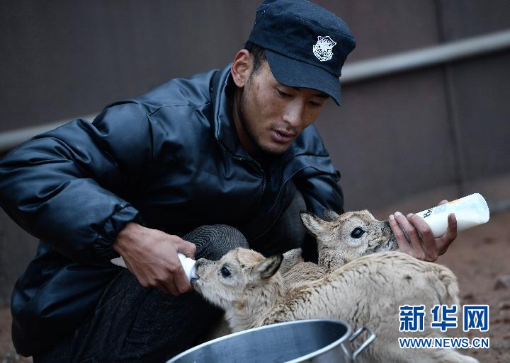 7月8日,三江源國家公園管理局長江源園區(qū)可可西里管理處卓乃湖保護站的工作人員才文多杰在給藏羚羊幼仔喂奶。新華社記者 張龍 攝