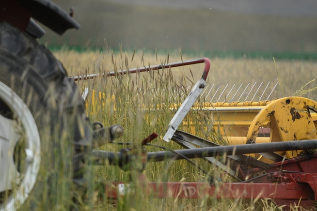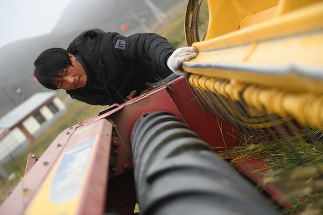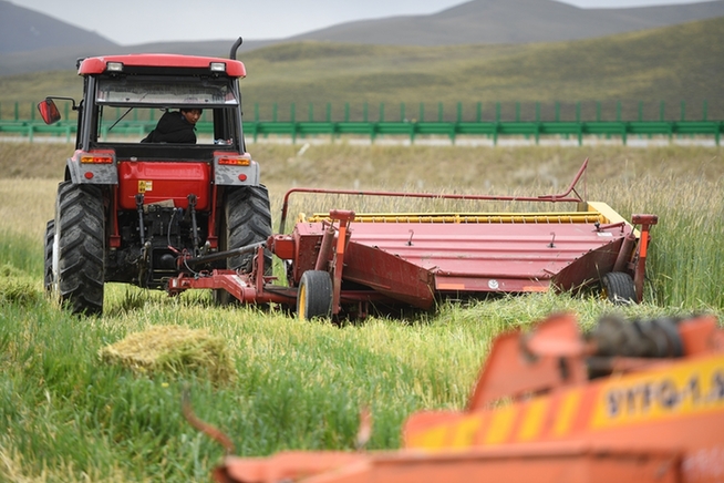 格多村村民藏木改駕駛收割機收割飼草種植基地的黑麥。新華網(wǎng) 潘彬彬 攝