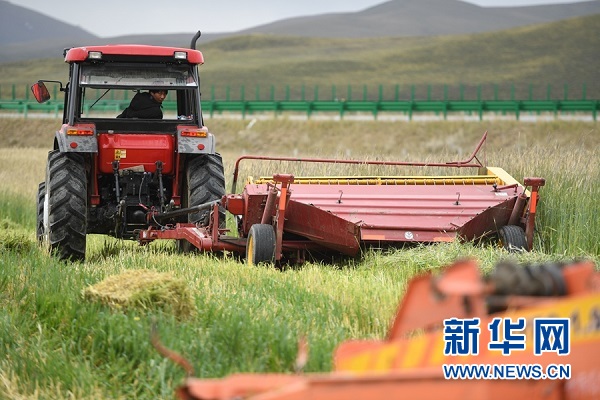 格多村村民新初駕駛打捆機進行飼草料打捆。新華網(wǎng) 潘彬彬 攝