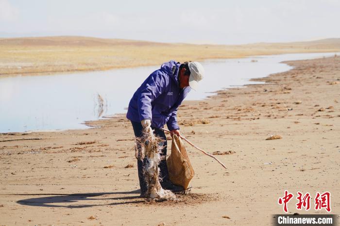 圖為牧民巡護(hù)隊(duì)隊(duì)員在青海湖畔撿垃圾?!∥乃碱?攝
