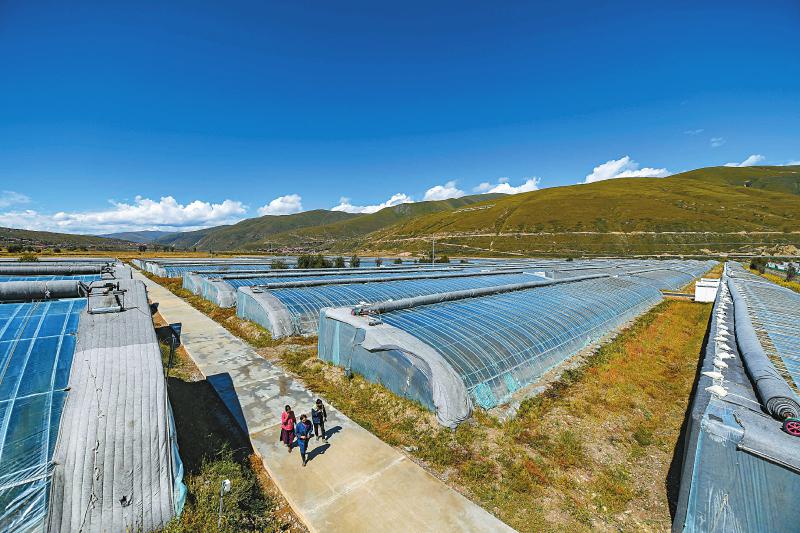 爐霍縣斯木鎮(zhèn)吉絨村飛地產(chǎn)業(yè)園區(qū),按照“土地集中、各村飛地、龍頭經(jīng)營、入股分紅”思路建起的蔬菜大棚基地。四川日報(bào) 楊樹 攝