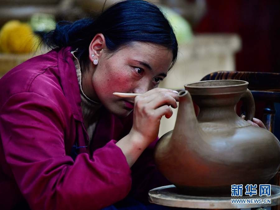 出身黑陶世家的謝格太就是當(dāng)?shù)赜忻暮谔占紟煛?014年,謝格太成立班瑪黑陶旅游產(chǎn)品開發(fā)有限責(zé)任公司,規(guī)模化生產(chǎn)和銷售黑陶,并帶領(lǐng)學(xué)徒一起鉆研黑陶技藝,傳承和創(chuàng)新黑陶手工技藝文化。和泥、捏制、打磨、發(fā)酵、火燒、熏黑、拋光,經(jīng)過十幾道工序的磨煉,學(xué)徒們在謝格太的帶領(lǐng)下,不僅學(xué)到了技藝,傳承了技術(shù),每月還能拿到數(shù)千元的生活補(bǔ)助。