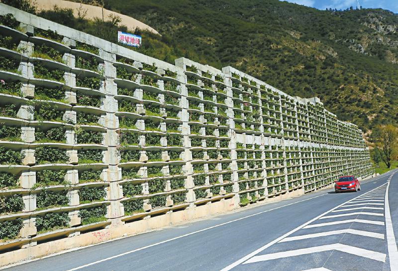 災(zāi)后重建中,九寨溝縣進(jìn)行地災(zāi)治理,并栽花種草,進(jìn)行綠化、美化,圖為公路擋墻變花墻。易西 攝