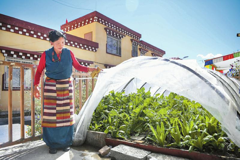 10月12日,甘孜縣吉絨隆溝集中安置點(diǎn)村民展示自己種植的蔬菜。四川日?qǐng)?bào) 楊樹 攝