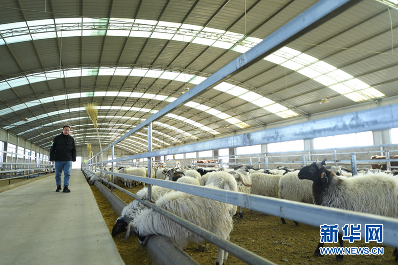 馬金山在羊棚里查看羊群長(zhǎng)勢(shì)。新華網(wǎng) 潘彬彬 攝