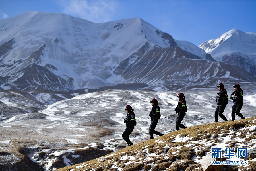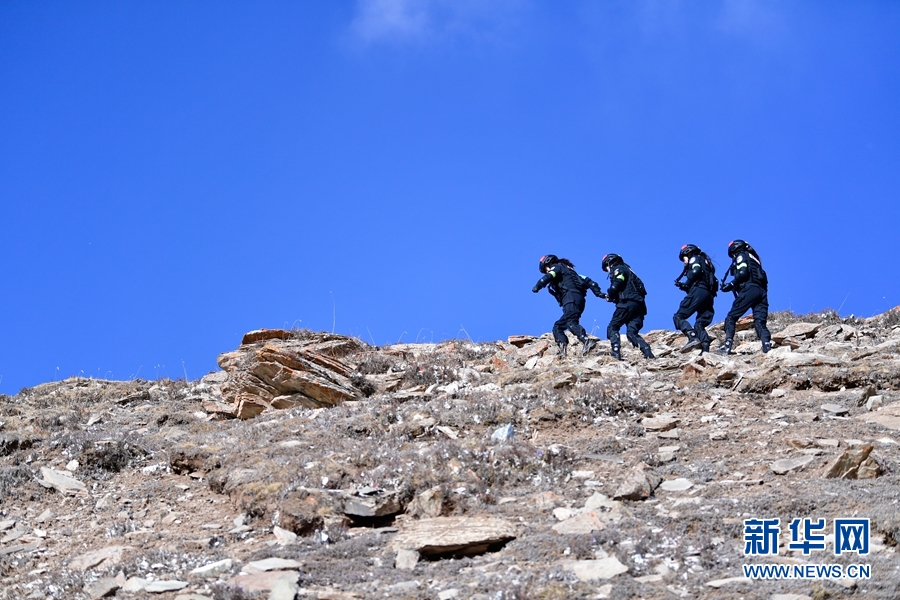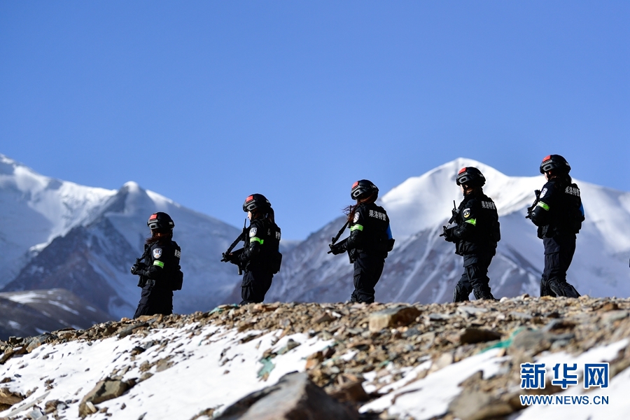 1月9日,青海省果洛藏族自治州公安局特警支隊(duì)直屬女子中隊(duì)的隊(duì)員們在阿尼瑪卿山腳下參加高原野外適應(yīng)性訓(xùn)練。新華社記者 張龍 攝