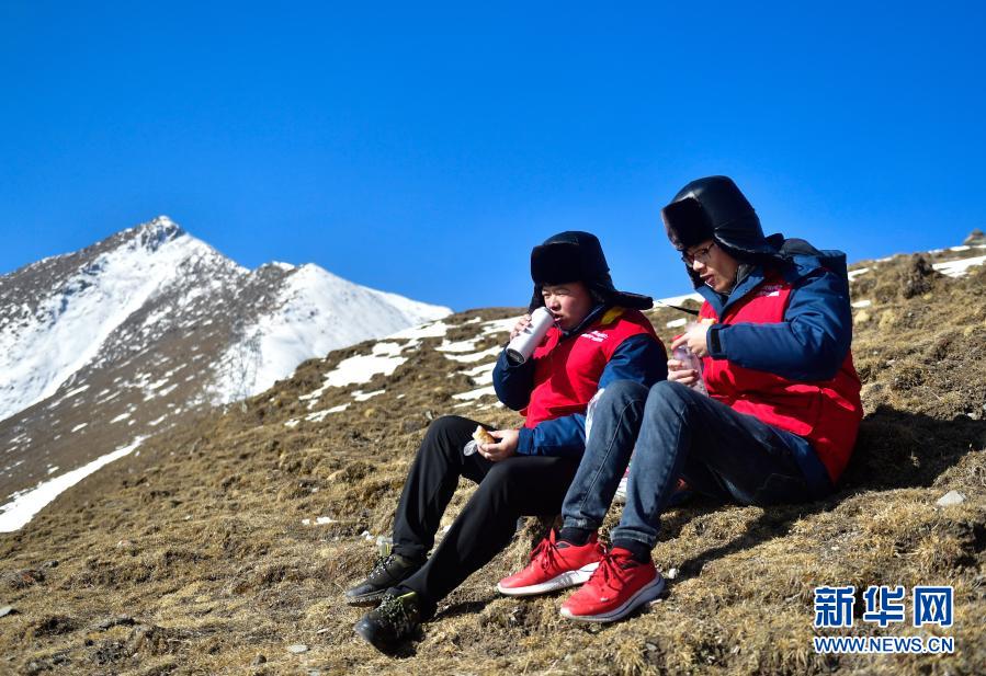 1月21日,國家電網(wǎng)西寧供電公司輸電運(yùn)檢中心運(yùn)檢人員在巡檢途中吃午飯。新華社記者 張龍 攝