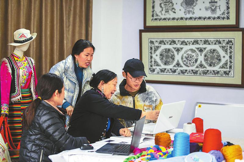 楊華珍(右二)組織設(shè)計師、藝術(shù)家和傳承人共同進行跨界設(shè)計,開發(fā)藏羌織繡文創(chuàng)產(chǎn)品。
