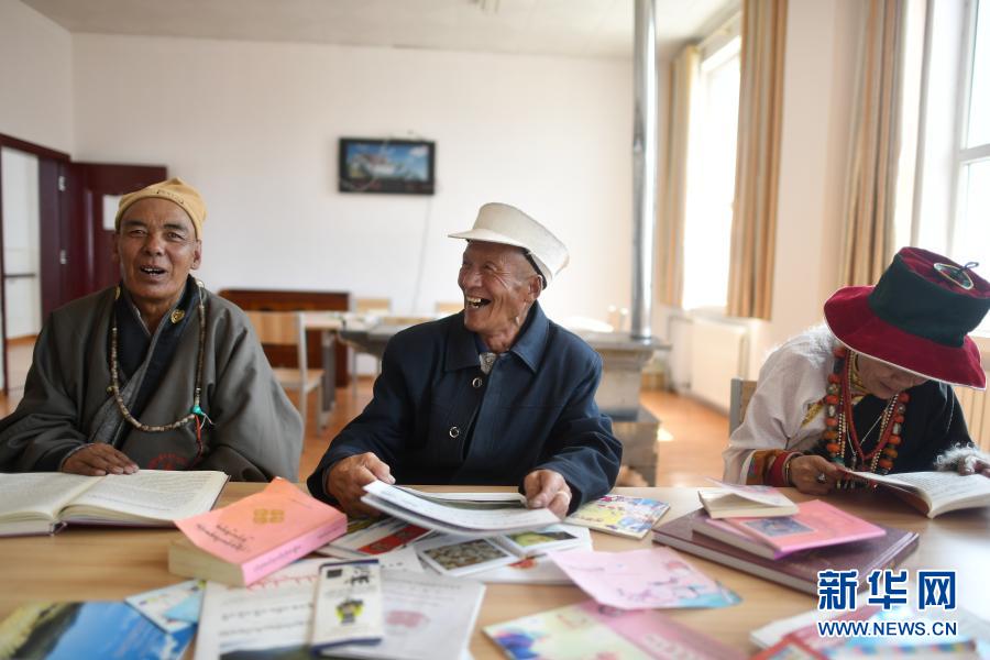 3月14日,78歲的公保(中)和同伴在治多縣幸福敬老院閱覽室內讀報。新華社記者 張宏祥 攝