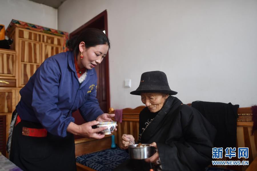 3月14日,幸福敬老院護工尼瑪卓瑪(左)為只沙群忠送餐。新華社記者 張宏祥 攝