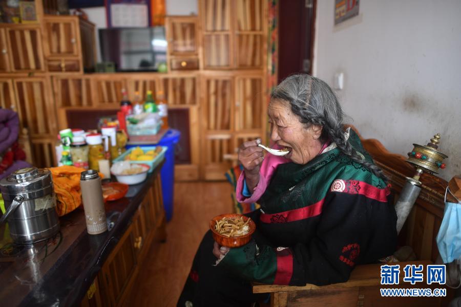 3月14日,來自多彩鄉(xiāng)的85歲老人格沙永瑪在幸福敬老院居室內吃午餐。新華社記者 張宏祥 攝