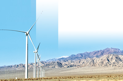 柴達木盆地上,巨大的風(fēng)力發(fā)電機正在運轉(zhuǎn)。記者 姜峰 攝
