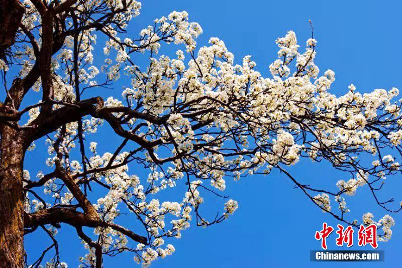 近日,四川省阿壩州金川縣萬畝梨花綻放,滿山遍野,雪白的梨花,隨風(fēng)飄絮,藍(lán)天白云,花海飄香,令人陶醉,吸引眾多游客前來游覽、拍照。代永清 攝