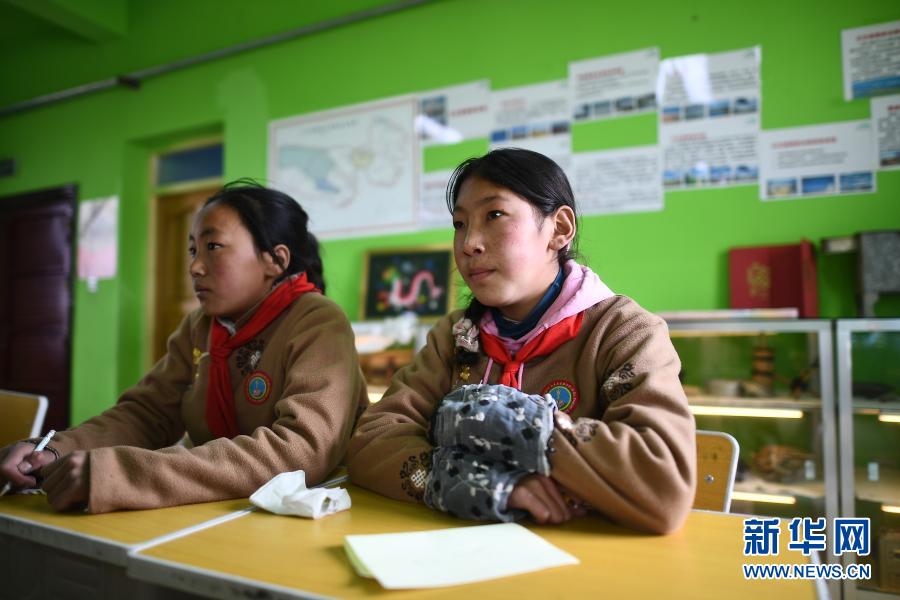 3月23日,吉尕小學(xué)學(xué)生達(dá)葉(右)在生態(tài)課堂上。新華社記者 張宏祥 攝