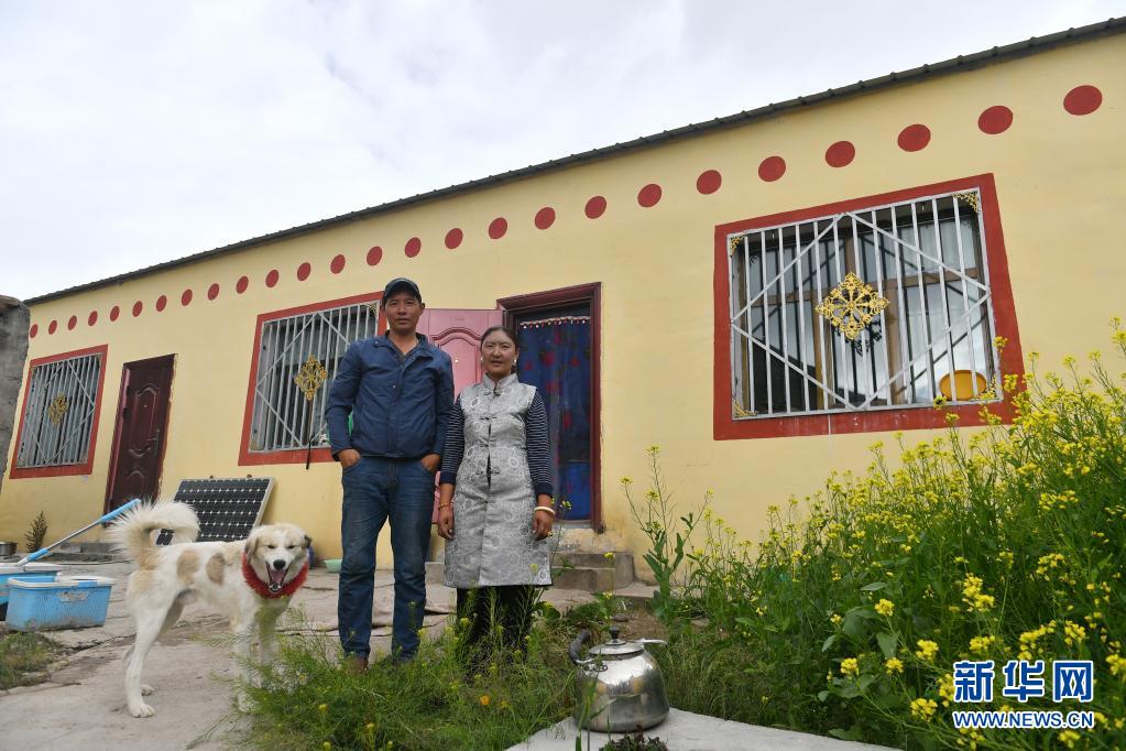 在青海省玉樹藏族自治州治多縣治渠鄉(xiāng)同卡村,村民昂文西讓和妻子布沙措江卓瑪站在易地搬遷的新家院子里合影(2019年9月12日攝)。新華社記者 孫瑞博 攝