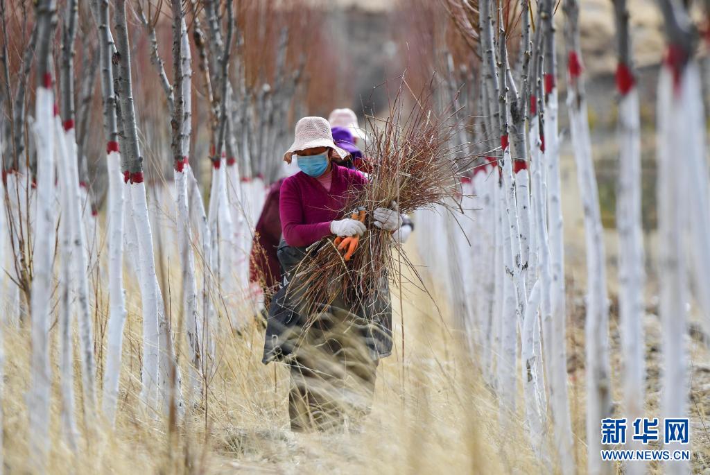 在青海省玉樹藏族自治州高原千畝林木良種繁育實(shí)驗(yàn)基地,當(dāng)?shù)厝罕娫谇謇硇藜暨^(guò)的樹枝(2020年3月29日攝)。新華社記者 張龍 攝