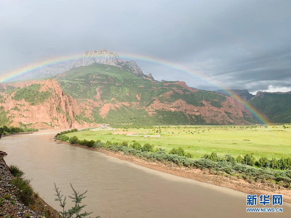 青海省玉樹藏族自治州雜多縣的昂賽大峽谷拍攝的彩虹(2020年8月22日攝)。新華社記者 李琳海 攝