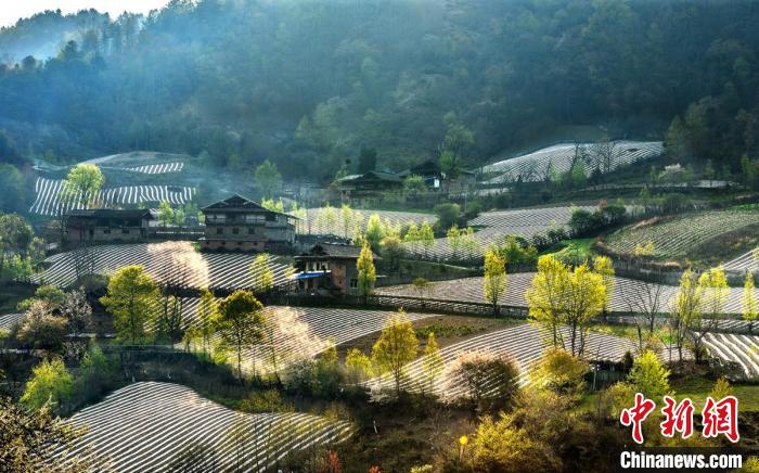 4月的四川雅安市寶興縣磽磧藏族鄉(xiāng),山坡上整齊有序的地膜,錯(cuò)落有致鋪在藏寨林間,構(gòu)成了一幅田園山水與天人合一的自然畫卷。