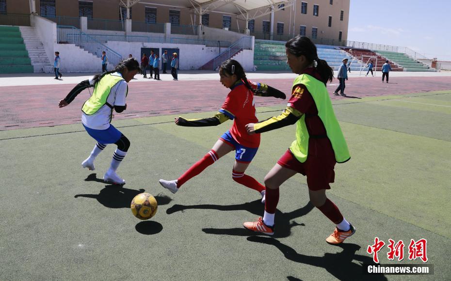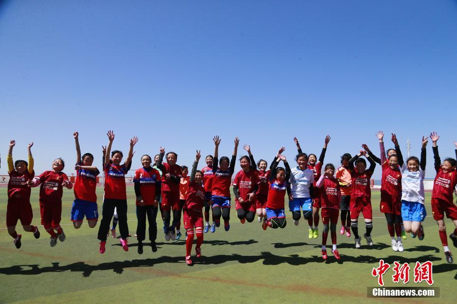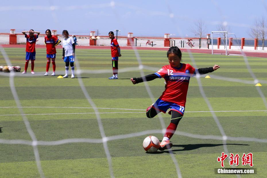 4月21日,青海省海南藏族自治州共和縣,青海湖民族寄宿制學校的足球場上,女子足球隊的隊員們正在進行訓練。該校的女子足球隊共有小學組、初中組隊員53人,皆為來自牧區(qū)的藏族女孩。中新社記者 馬銘言 攝