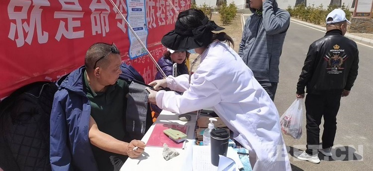 圖為四川理塘工作人員給游客測(cè)血壓